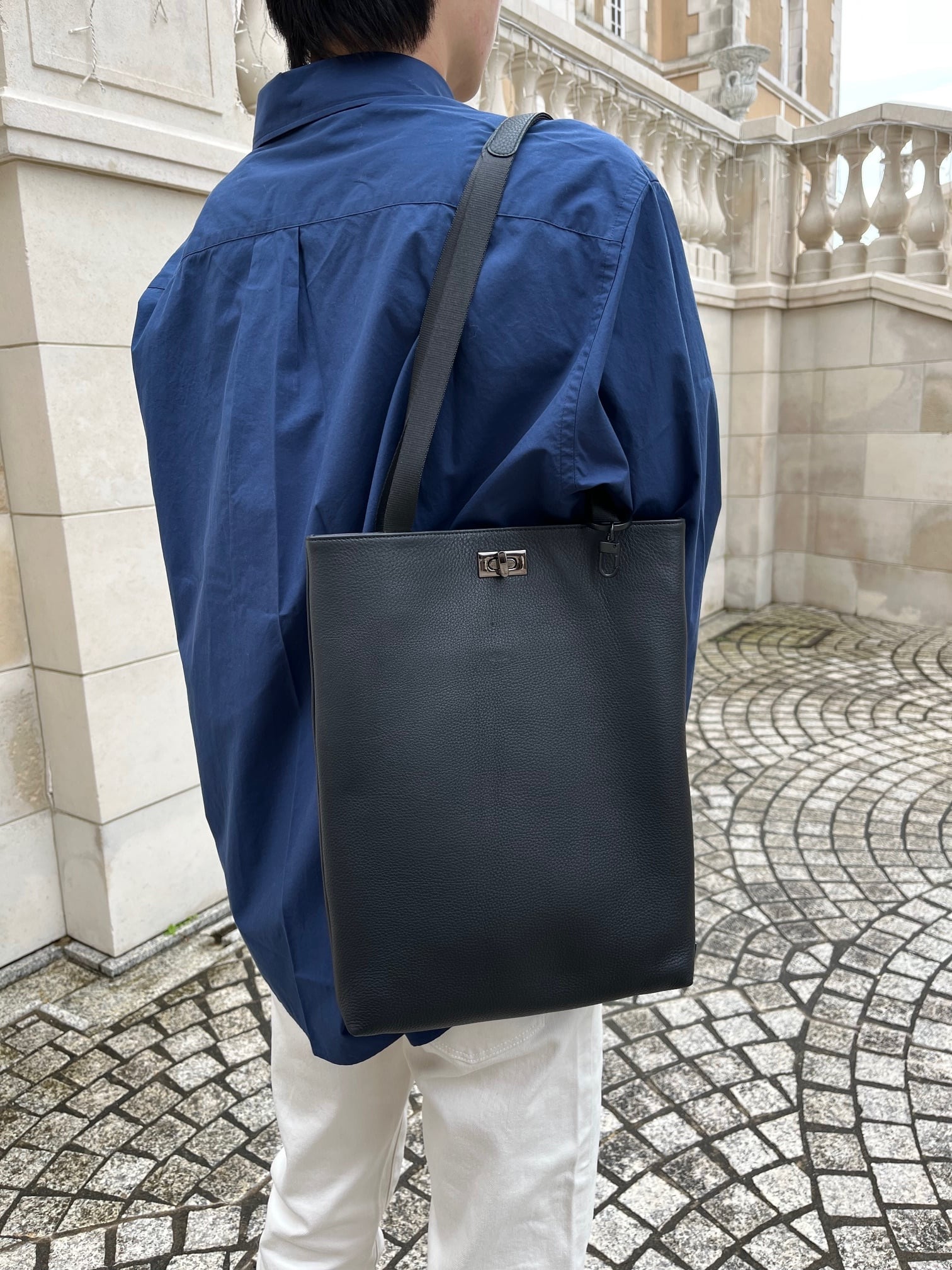 柔らかい質感の牛革を使用した、ひねり金具付きのトートバッグになります。