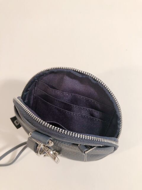 内装にカード段やお札を折って入れるポケットが付いており、小銭は背面のファスナーポケットに収納可能です。